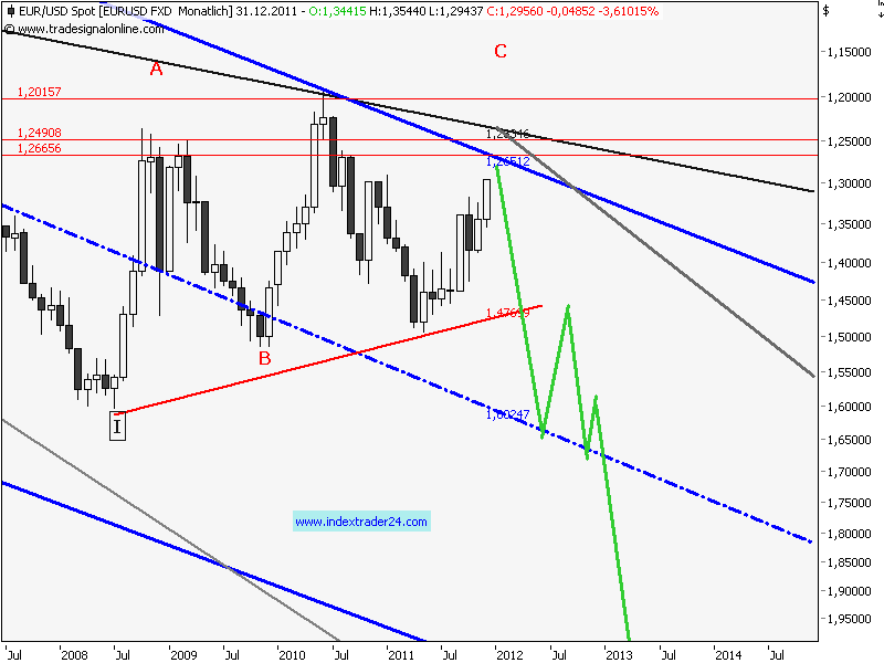 Der obenliegende Chart gibt das vorgenannte Szenario eines geordneten Untergangs der US-Dollar im kommenden Jahr wieder - an dessen Ende dessen totale Entwertung stehen wird. Daher wurde auch eine Log-Darstellung gewählt. Beachten Sie die Marke von 1.26844 Euro die ich hier schon vor einigen Wochen nannte.